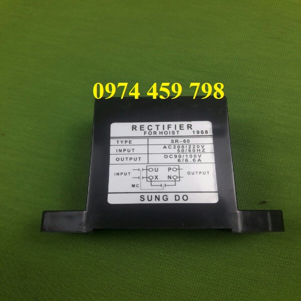 Diot thắng cầu trục hiệu Sungdo có nguồn điện vào 220V và ra 99V, là sản phẩm chính hàng nhập khẩu Hàn Quốc. Diot thắng cầu trục hiệu Sungdo là nhãn hiệu nỗi tiếng được người dùng ưu tiên lựa chọn nhất hiện nay.